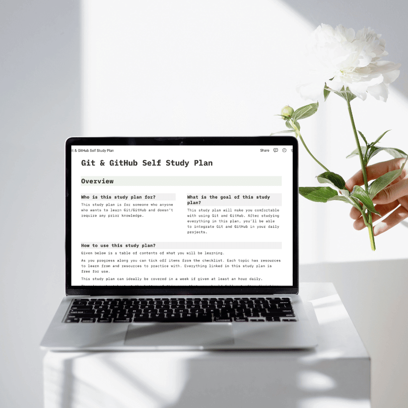 I want this!This study plan is a Notion template that will make you comfortable with using Git and GitHub. After studying everything in this plan, you’ll be able to integrate Git and GitHub in your daily projects.