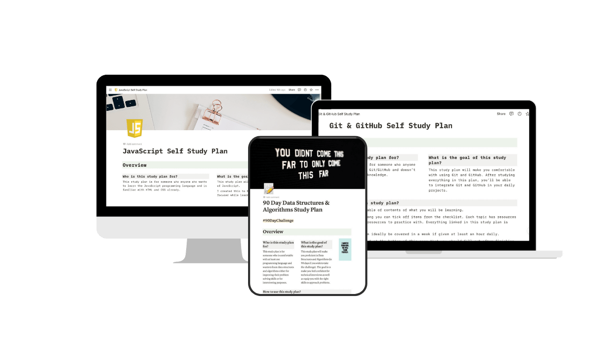 These study plans are hosted on Notion and are designed to help you achieve your goals, no matter how busy your schedule. With customizable timelines and a variety of resources, you can stay motivated and on track throughout your journey.